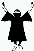 | Raise both arms into the air, forming a great Why? with your body. | Place the left hand under the right arm (High Initiates may put their hand inside their robe) | Clench the right fist and bring your arm down sharply, as if pulling the Emergency break on a New York City subway train. |